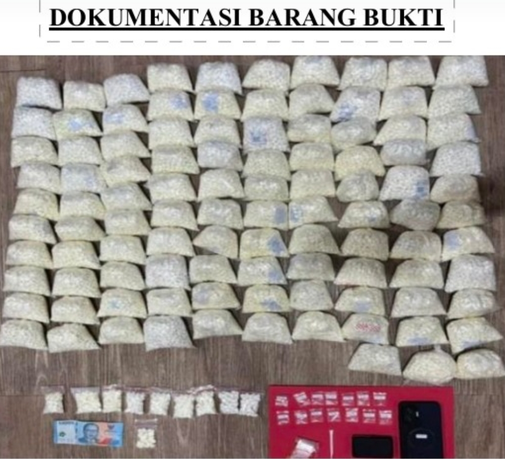 Dalam penggerebekan tersebut, petugas mengamankan barang bukti berupa 104.961 butir pil double L, 14 poket sabu dengan berat total 2,42 gram, satu unit timbangan elektrik, tiga bendel plastik klip kosong, satu alat sekrop dari sedotan, satu unit sepeda motor tanpa nomor polisi, dua unit telepon genggam, serta uang tunai sebesar Rp1 juta.