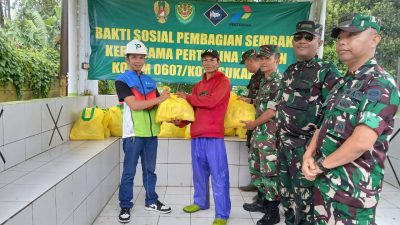Komandan Kodim 0607 /Kota Sukabumi Letkol Inf. Yudhi Hariyanto S.Hub.Int yang diwakili oleh Pasiter Kodim Kapten Inf. Mahmud memberikan Bantuan Sembako kepada Petani Penggarap lahan Aset Tanah PT Pertamina (Persero) di wilayah Desa Titisan Kec. Sukalarang Kab. Sukabumi.