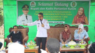 Kutai Timur.Suluhnusantara.News ~ Sangatta, 24 Juli 2024 – Kepala Dinas Pertanian Kabupaten Kutai Timur, Dyah Ratnaningrum, menghadiri acara pengukuhan kelompok tani Telaga Bening yang dihadiri oleh 22 kelompok tani, Bupati Kutai Timur Ardiansyah Sulaiman, perwakilan Kades Kandolo, dan perwakilan Camat Teluk Pandan.Dalam sambutannya, Dyah menekankan pentingnya sertifikasi kelompok tani untuk mendapatkan bantuan pemerintah.