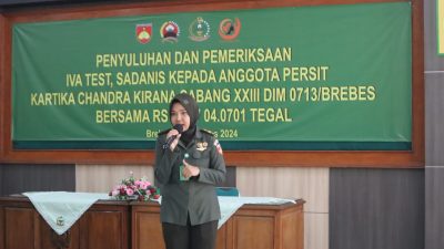 Lettu Ckm (K) dr. Ariska Nur Azizah dari Rumkit Tk.IV 04.07.01 Tegal kemudian memberikan penjelasan mengenai prosedur dan manfaat IVA Test dan Sadanis. Ia menjelaskan bahwa IVA Test adalah metode sederhana namun efektif untuk mendeteksi dini kanker serviks, sementara Sadanis adalah pemeriksaan klinis payudara untuk mendeteksi kelainan yang berpotensi menjadi kanker. Dr. Ariska juga mendorong para peserta untuk rutin melakukan pemeriksaan kesehatan guna mencegah penyakit sejak dini.