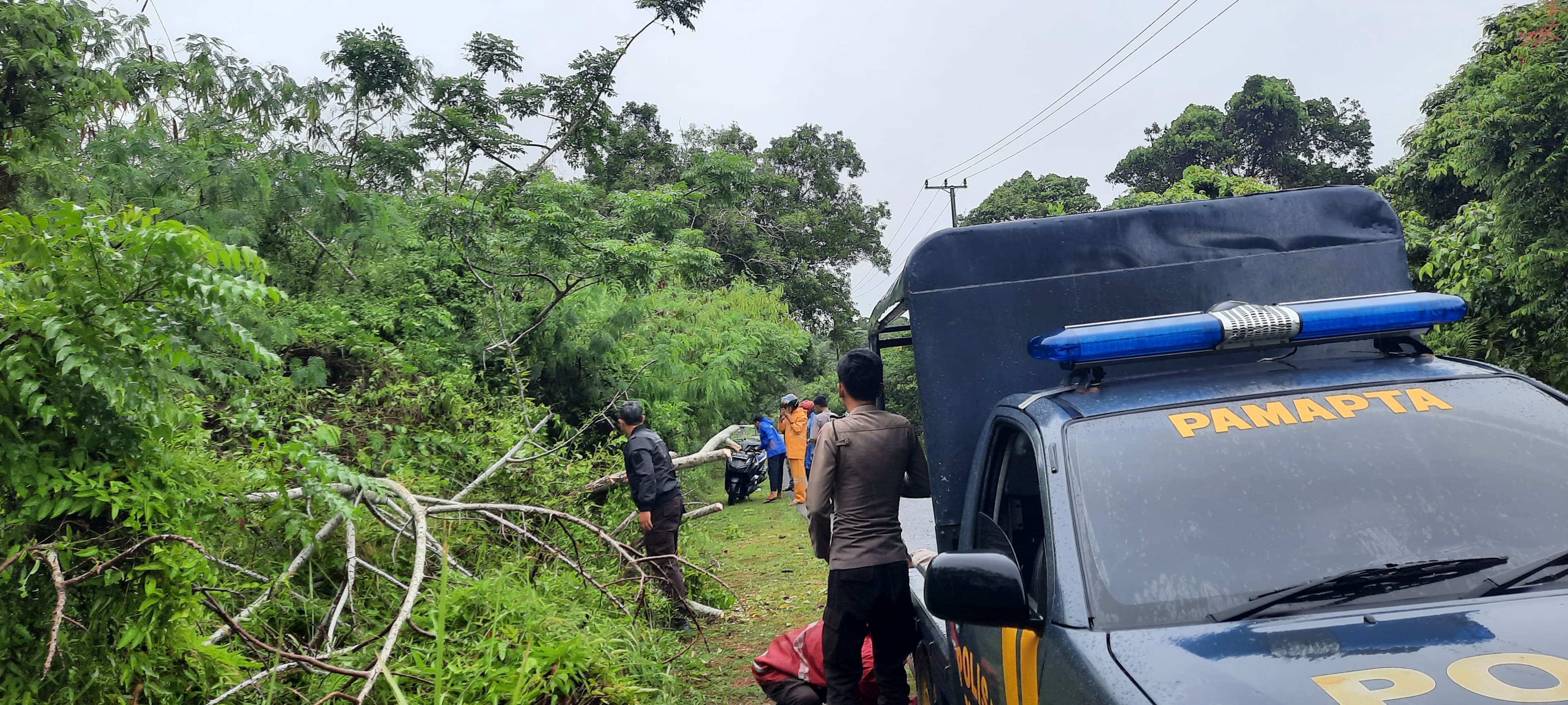 Personel Piket Pawas, Samapta 1, bersama anggota SPKT Polres Bangka Barat langsung menuju lokasi setelah menerima laporan. Di lapangan, petugas tidak bekerja sendiri, melainkan bersama warga setempat bahu-membahu mengevakuasi batang pohon yang menutup badan jalan.