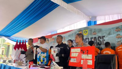 Konferensi pers digelar di halaman Mako Polres Bogor, Jalan Tegar Beriman, Cibinong, Jumat (9/5/2025). Barang bukti dihadirkan dalam konferensi pers tersebut.