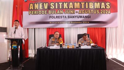 Banyuwangi – Kepolisian Resor Kota Banyuwangi menggelar Analisa dan Evaluasi (Anev) Situasi Keamanan dan Ketertiban Masyarakat (Sitkamtibmas), yang dilaksanakan di Polsek Banyuwangi. Kamis(19/09/2024) Dalam kegiatan tersebut masing masing Satuan Fungsi (Satfung) dan Polsek Jajaran Polresta Banyuwangi, diberikan kesempatan menyampaikan hasil analisa dan evaluasi situasi Kamtibmas dan kinerja di satfung dan wilayah masing – masing.