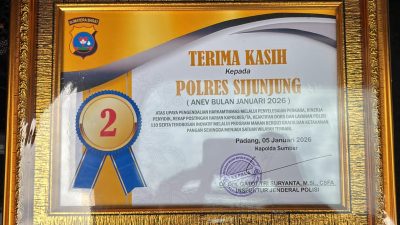 Penghargaan tersebut diterima langsung oleh Kapolres Sijunjung AKBP Willian Harbensyah, S.I.K., M.H., dan diserahkan secara resmi oleh Kapolda Sumatera Barat Irjen Pol Dr. Drs. Gatot Tri Suryanta, M.Si., CSFA, pada Kamis, 5 Februari 2026 di Tanah Datar, dalam kegiatan GO Anev yang digelar di lingkungan Polda Sumbar.
