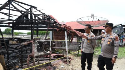 Kapolres dengan didampingi sejumlah pejabat utama Polres Aceh Timur dan Kapolsek Peureulak tiba di lokasi langsung mengecek kondisi keude kopi milik Hindun yang mengalami kerusakan akibat kebakaran pada Rabu, (12/03/2025) pagi dinihari.