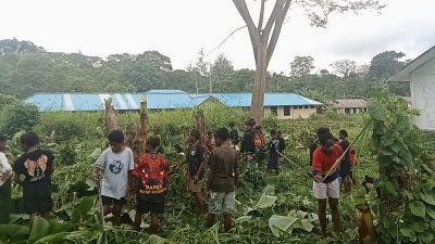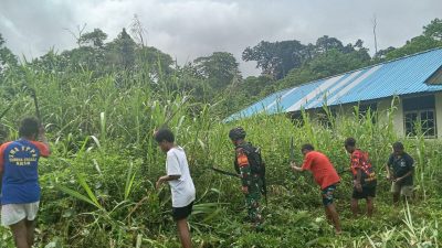 Keerom-Suluhnusantara.News – Sambut tahun ajaran baru 2024-2025 serta menjaga lingkungan sekolah agar tetap bersih dan nyaman, Pos Bompay Satgas Yonif 310/KK bersama siswa-siswa SMPN 1 Satap Bompay membersihkan lingkungan sekolah sebagai upaya menanamkan pola hidup bersih sejak dini di Kampung Bompay, Distrik Waris, Kabupaten Keerom, Jumat (19/7/2024).